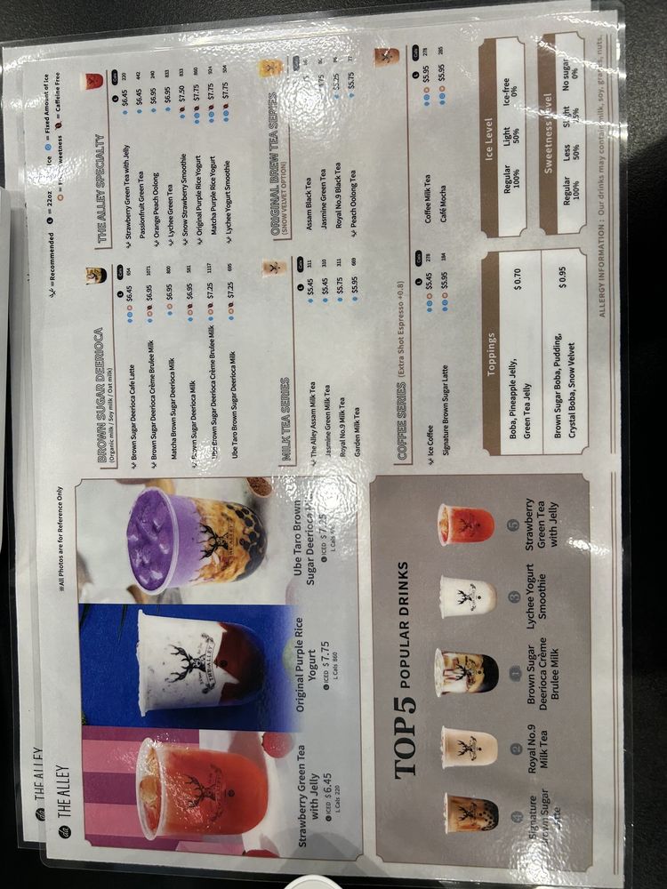 Introducing the menu at The Alley, a dessert haven located in San Diego, CA. The Alley offers a range of delectable treats, including their famous Brown Sugar Deerioca series featuring unique creations like Brown Sugar Deerioca Cafe Latte and Ube Brown Sugar Deerioca Creme Brulee Milk. The Coffee Series boasts enticing options like Cafe Mocha and Signature Brown Sugar Latte. Milk Tea lovers will delight in choices such as Garden Milk Tea with Oreo Crumbs & Mint and The Alley Trio Milk Tea with Boba, Pineapple Jelly & Konjac Jelly. With a diverse menu and cozy ambiance, The Alley is a must-visit for food enthusiasts seeking a sweet indulgence. Don't miss out on experiencing the delightful flavors and inviting atmosphere at The Alley!